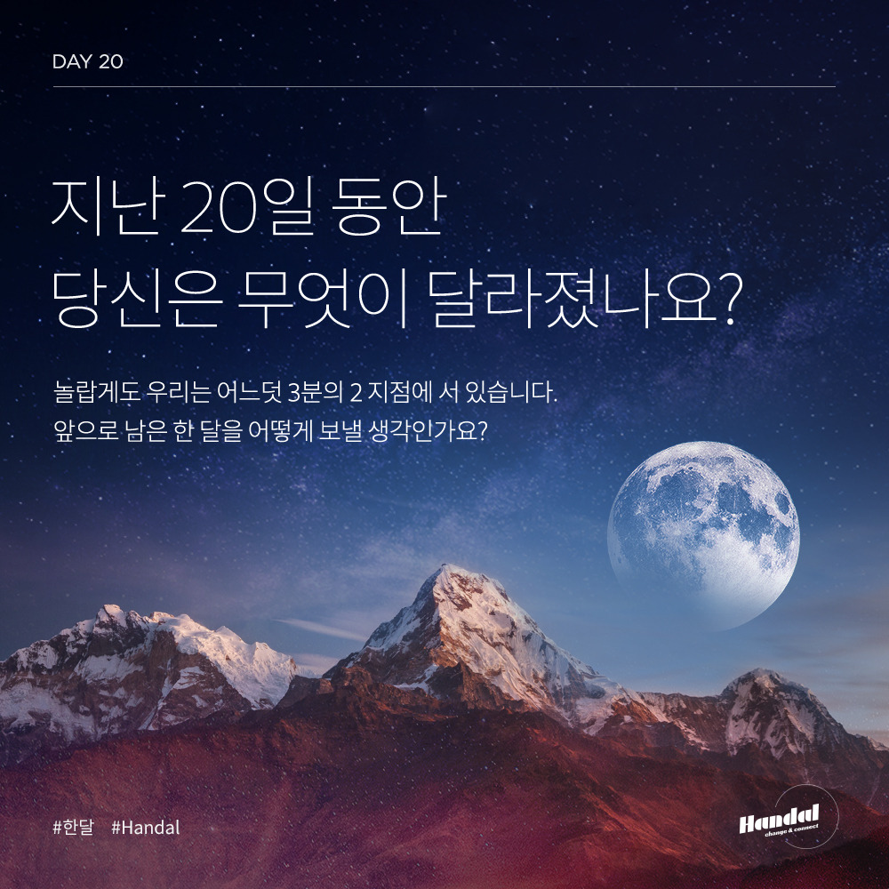 앞으로 10일간의 여정이 남아있다. 어떤 질문이 주어질지 궁금하다. 사실 질문이 아주 심오해 어떻게 답을 해야 할지 혼란스러울 때가 있다. 그러나 정답은 정해진 게 아니며, 내가 원하는 답을 만들면 된다는 생각으로 하루하루 글을 써 왔다. 남은 시간 동안 남에게 보이기 위한 글이 아닌, 나를 살리는 글을 썼으면 좋겠다.