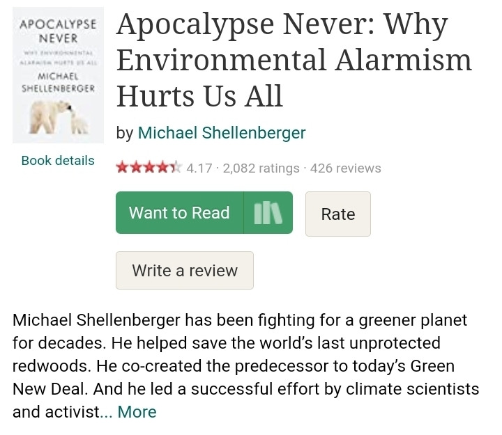 덧) 이 책은 굿리즈 펑점 5점 만점 중 4.17점을 기록했다. 그러나 국내 평점은 10점 만점 중 4.75에 불과하다. 이렇게 상반된 평가가 나오는 이유는 아마도 국내 환경주의자들이 책 내용을 받아들이기 힘들어 하는 것일 수도 있겠다.