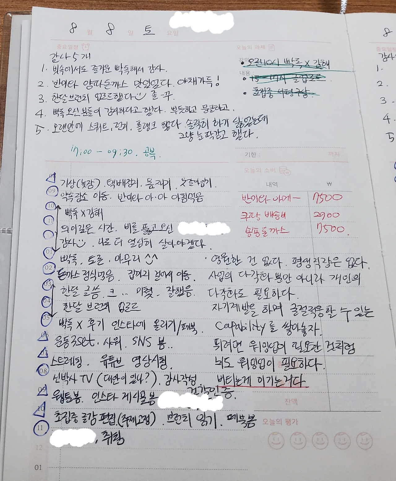 하루를 24시간을 나누어 매시간마다 무엇을 했는지 적는다. 그다음 각 시간마다 상, 중, 하 평가한다.