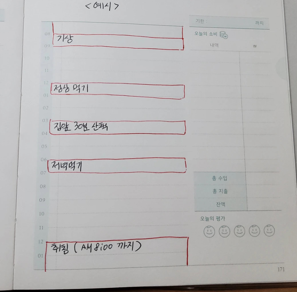 특히 아침에 일어날 때 피곤함이 줄어들었고 여태까지 감기 한 번 걸리지 않았다. 생각도 긍정적으로 바뀌고 피부가 맑아졌다. 그러니 꼭 자신의 하루 일과표에 수면, 식사, 운동시간을 먼저 정해서 적어보길 바란다.