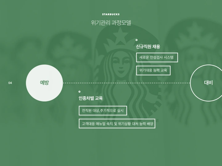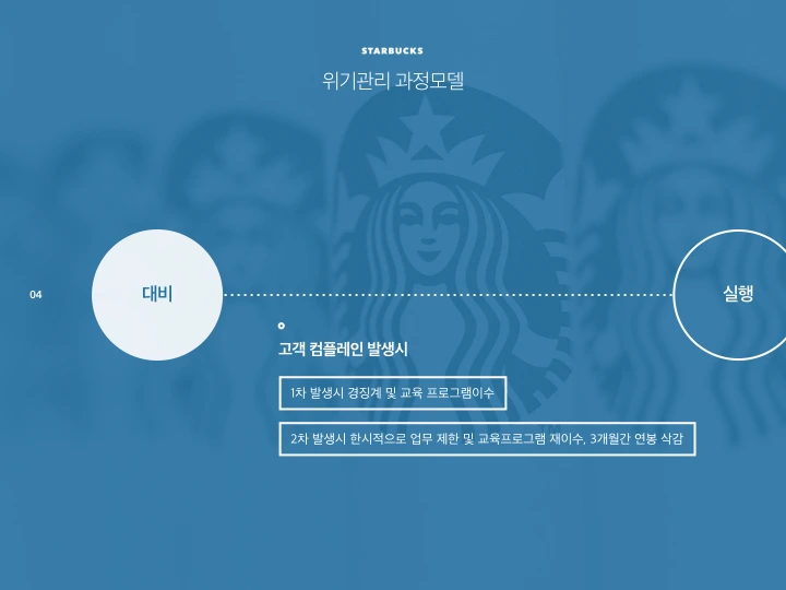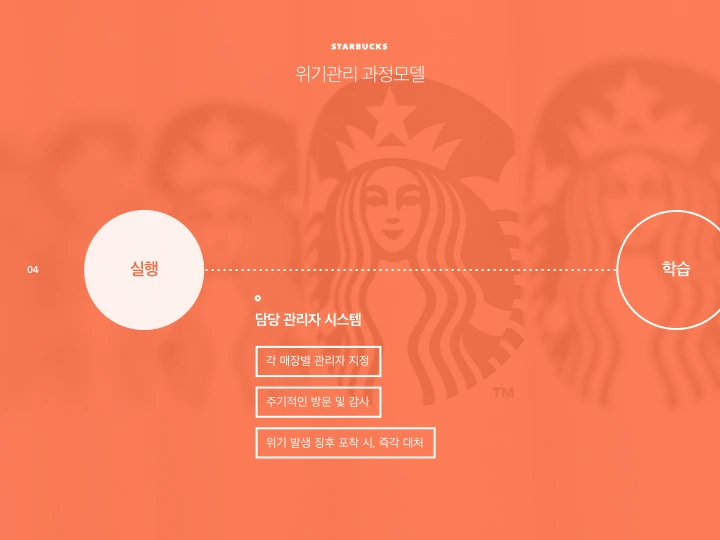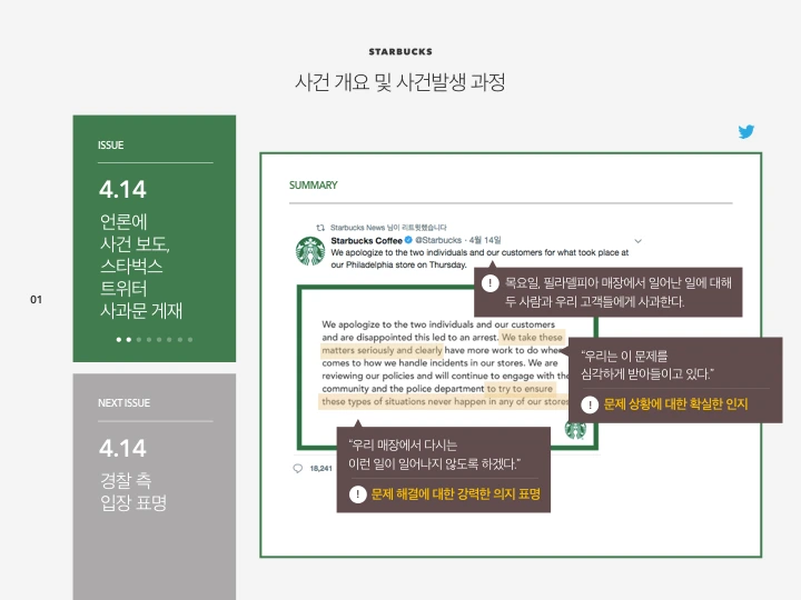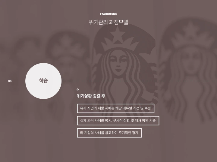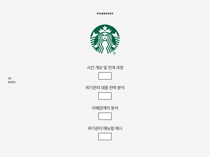 스타벅스의 위기관리 히스토리와 관련된 이슈를 시간순으로 나열하는 '타임라인 구성'이 가장 중요한 발표였다. 위기를 맞이하고 극복한 사례 위주로 내용을 전달해야 하기 때문에 가독성을 고려해야 했다. 내용을 담기 전엔, 스타벅스의 여러 디자인 요소들을 살리면 만들기 쉽겠다 생각했었지만 사용할 수 있는 소스들이 한정되어있었다. 결국은 최대한 결이 맞는 컬러로 포인트를 주고, 다른 부분에서는 정제된 느낌을 가져갔다.