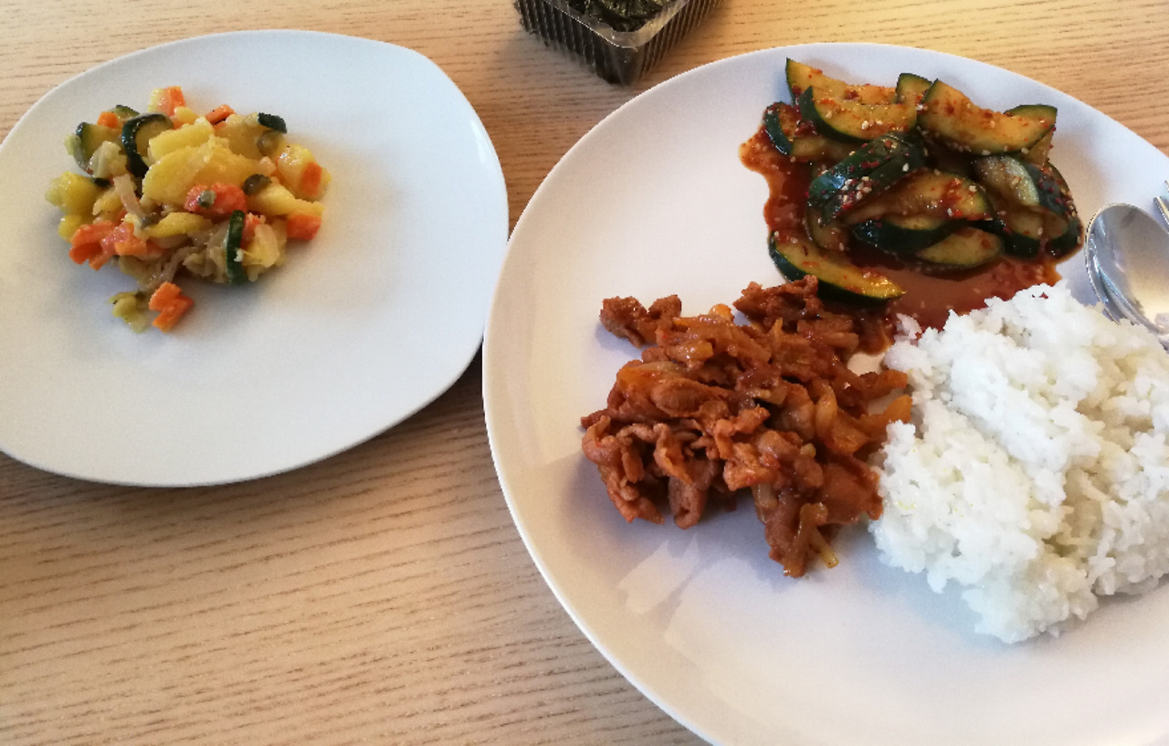 냉동 삼겹을 꺼내 녹이고 간단히 양념장에 30분정도 재웠다가 제육볶음 하고, 신선한 오이가 있어 김치대용으로 무쳐냈다. 김 하나 놓고 먹으니 꿀맛.