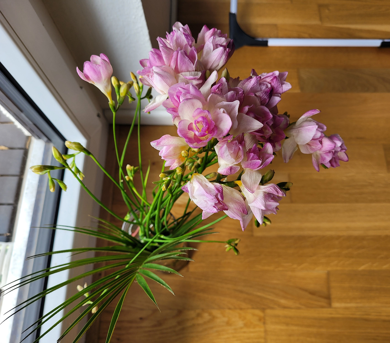산책하다 눈에 들어온 흔치않은 분홍 프리지아 업어와, 햇살받으라고 창가에 놓아두니 볼때마다 웃음이 난다.