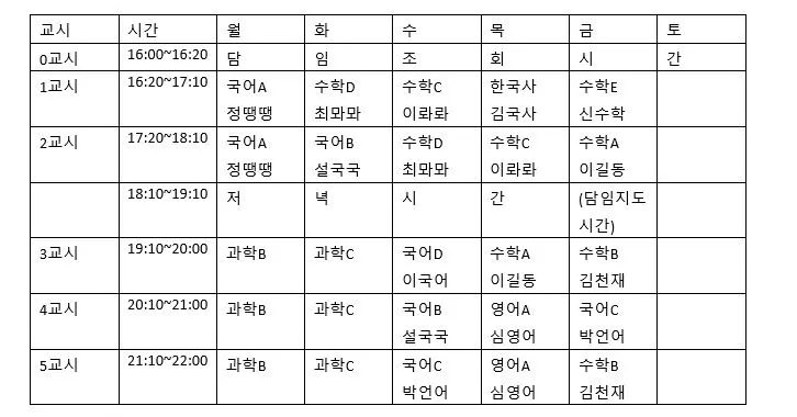 네 시 이후가 6야반의 핵심, 수업이다. 4시부터는 고등학교처럼 시간표가 짜여져있다. 다음은 그 예시다. (모든 선생님의 이름은 임의로 바꾸어 표시했다.)