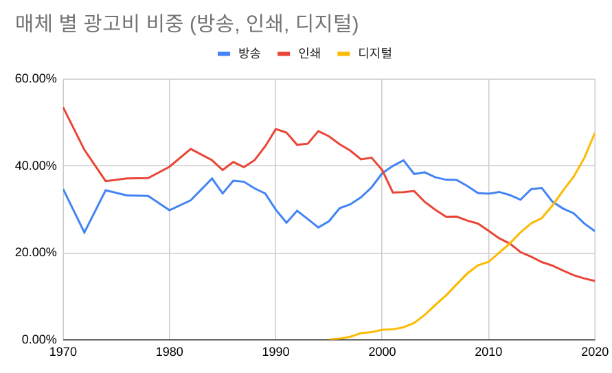수많은 대중에게 도달할 수 있는 대중 매체는 사라지고, 디지털 매체가 비교 우위에 있는 시기