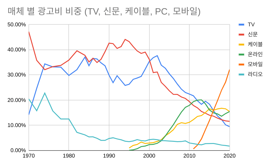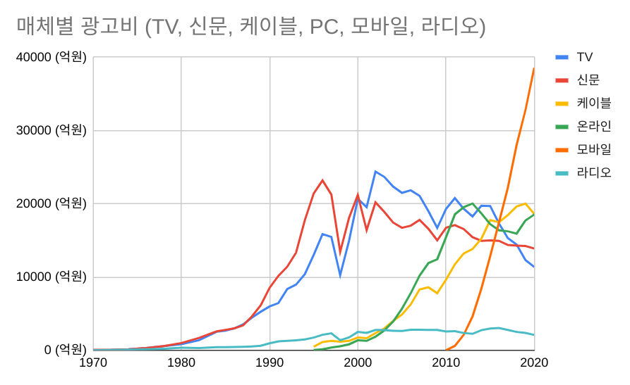 이는 광고비 총액 그래프에서도 확인할 수 있다. [표 5]에서 보면 현재 모바일 매체의 광고비는 3조 8,558억으로 기존 모든 매체의 최고 광고비 수주액 (신문 2조 3,185억 1996년, TV 2조 4,394억, 인터넷 2조 30억 2013년, 케이블 (종편 포함) 2조 17억 2019년)을 모두 뛰어넘을 정도로 매우 큰 금액이다. 이는 모바일이 이렇게 독보적인 광고비 규모를 보이는 것은 가구 단위로 사용했던 다른 기기와 다르게 개인 기기이기 때문일 것이다. 통계도 TV나 PC, 인터넷은 가구가 단위이지만, 스마트폰은 개인이 단위이다. 그런데도 광고 비중은 32.14%로 아직 TV나 신문이 달성했던 최고 비중을 달성하지 못했다. 게다가 2020년 기준 모바일을 제외한 TV, 신문, 케이블, 온라인의 광고 비중은 서로서로 비슷하다.