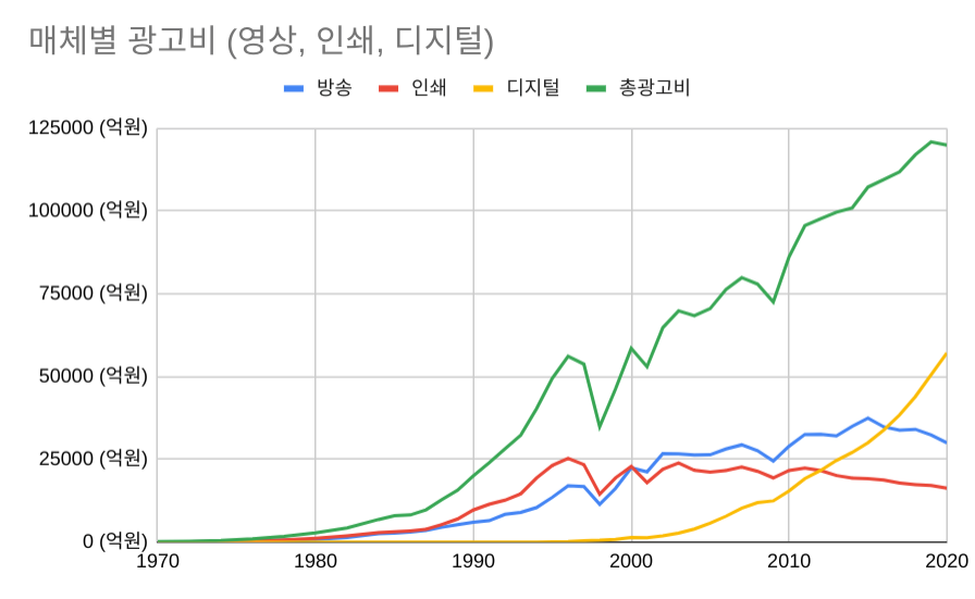 첫 번째 시기의 종점은 2000년으로 정하였다. 광고비 비중에서 방송 매체가 인쇄 매체를 이긴 시점이다. 이는 각 매체의 대표 주자인 TV가 신문을 이긴 시점이기도 하다. 그러면, TV는 언제 방송 매체의 대표 주자가 되었을까? 과거 권위주의 국가였던 한국이기 때문에 광고비 통계로는 이를 정확히 살펴보기가 어려운 점이 있어서 복합적으로 살펴봐야 한다.