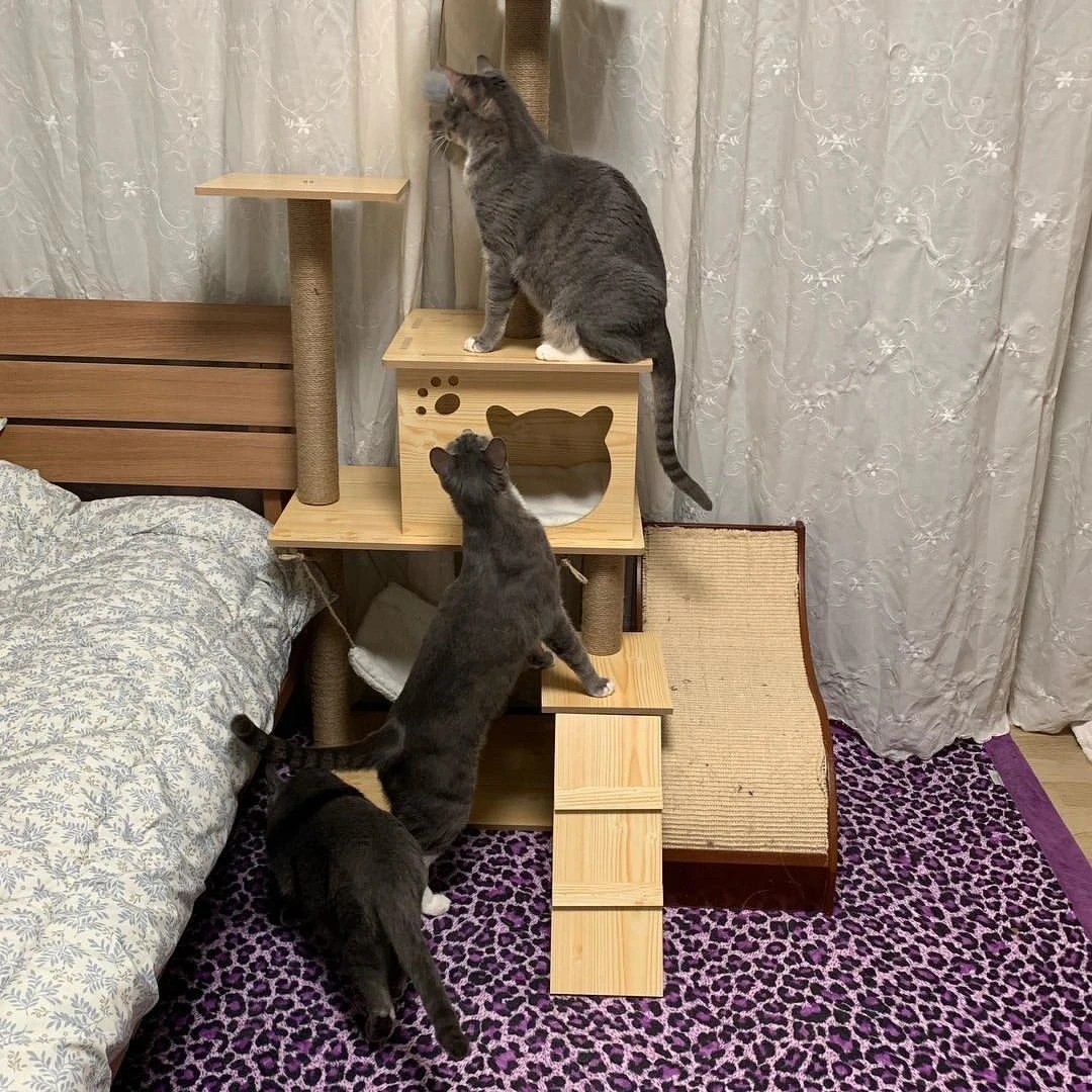 “낚시 놀이는 진짜 팔 빠지도록 했어요. 실컷 놀리고 나서 재우면 밤에 안 깨고 같이 잘 수 있어서 좋긴 한데, 아무래도 같이 놀아주다 보면 고양이들이 일부러 할퀴려고 그런 게 아니라도 발톱에 긁힐 때가 있거든요. 특히 여름에는 옷 소매가 짧으니까 놀아줄 때 좀 조심스러운 면도 있죠.”