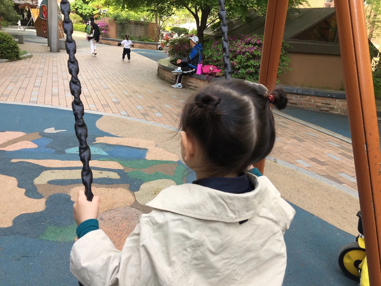 음.. 무슨 상황이지. 나는 그 아이가 얼마나 그네를 타고 있었는지도 모르고 그 아줌마가 얼마나 오래 기다렸는지도 모른다. 단지 솔이랑 내가 줄을 서자마자 이런 대화가 오갔고 그 아이는 울면서 걸어갔다. 근데 정말 더 이상한 일이 일어났다. 그렇게 우는 아이 뒤로 자기 아이를 앉힌 그 아줌마는 아이가 열 번도 타지 않았는데 딸에게 이렇게 말했다. '저기 뒤에 동생 기다리니까 이제 그만 타고 내릴까?'
