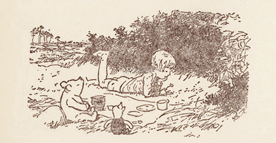 <Winnie the Pooh>의 일러스트를 의뢰 받은 어네스트 셰퍼드는 인생의 한 시기, 모든 것이었을 세계를 구현해 낸다. 명칭이나 설정은 동화적으로 윤색되었지만 작품의 모델이 된 애쉬다운 숲의 목가적인 아름다움이 고스란히 담겨 있다. 풍경화가로 진즉에 명성 높던 셰퍼드지만 <Winnie the Pooh>의 생명력 넘치는 풍광과 캐릭터들은 풍경화를 넘어선 명성을 가져다준다. 이 명성은 비슷한 카테고리로 볼 수 있는 <버드나무에 부는 바람 The Wind in the Willows, Kenneth Grahame, 1931>의 일러스트로 더욱 공고해진다.