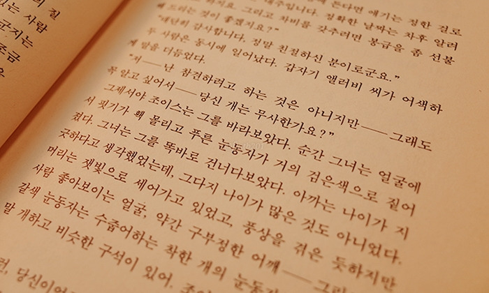 그제서야 조이스는 그를 바라보았다. ..머리는 잿빛으로 세어가고 있었고, 풍상을 겪은 듯 하지만 사람 좋아 보이는 얼굴, 약간 구부정한 어깨.. 그리고 그 갈색 눈동자는 수줍어하는 착한 개의 눈동자를 닮았다. 정말 개하고 비슷한 구석이 있어. 조이스는 속으로 중얼거렸다.