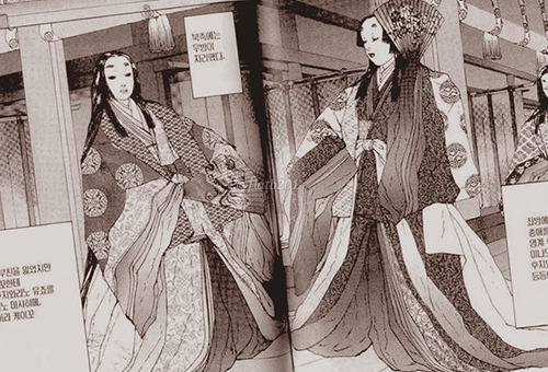이런 제도적 억압은 예법으로 포장해 강요된다. 기모노는 현재도 서양 복식사가 우스운 빠듯한 규칙의 복식이지만 헤이안 시대의 착장은 분량부터 엄청났다. 여덟 겹으로 시작한 예복은 신분이 높아질수록 배수로 더해 입었다. 겐지의 강간 시도를 피해 우츠세미가 도망친 자리에 남겨진 옷들이 매미 껍질* 같았다는 대목은 절대 과장이 아니었던 것이다.