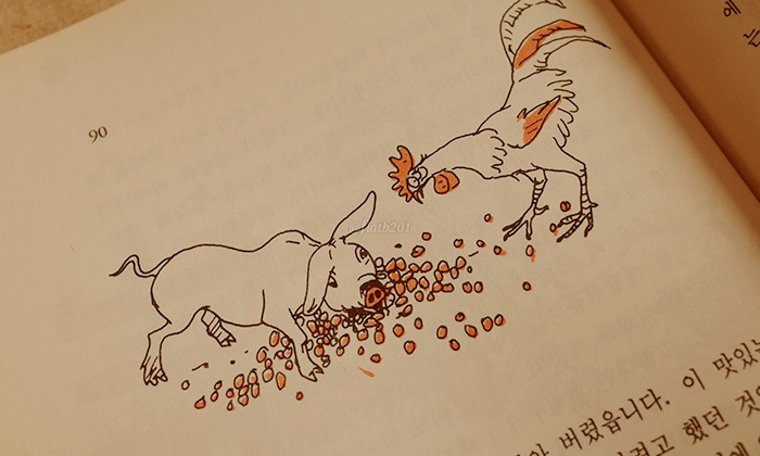 어머니의 심부름으로 버찌 찌꺼기를 한 양동이나 버리러 가던 오후, 여느 때처럼 아버지의 천덕꾸러기 돼지는 에밀의 뒤를 졸졸 따라온다. 어차피 찌꺼기니까 간식으로 먹게 놔둔 버찌 찌꺼기에 돼지는 코를 박은 채 기뻐 정신을 못 차린다. 농장의 대장 수탉까지 가세하자 에밀은 슬며시 궁금해진다. 코끝에 올라오는 달큰함에 에밀은 돼지와 함께 버찌를 한 두 개씩 주워 먹기 시작한다.