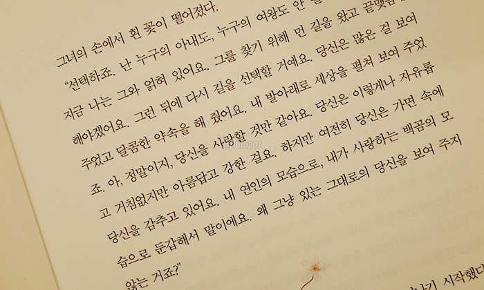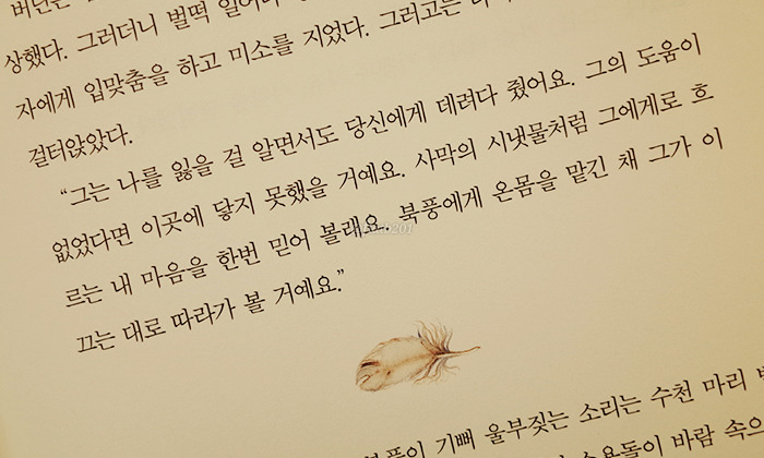 ..그는 정신없이 빛을 내며 그녀의 주위를 돌기 시작했다. 그녀가 사랑하는 백곰의 모습을 하고 있었다. 잠깐이었지만 백곰의 뒤로 창백한 남자의 얼굴이 살짝 비쳤다. 그녀는 가면 뒤에 숨은 북풍의 진짜 얼굴을 본 거라고 생각했다.