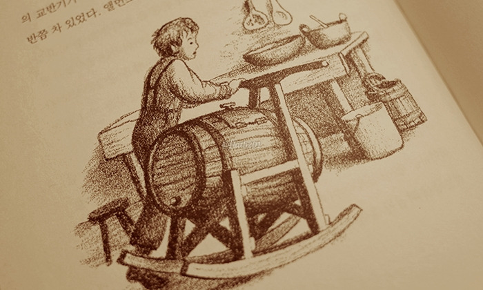 로라와 메리는 수제 절구에 담긴 우유가 크림으로 덩어리 질 때까지 끊임없이 휘젓는다. 로라의 남편이 될 앨먼 조도 자급자족의 삶에 익숙했기에 틈나는 대로 이 지루한 작업을 직접 반복했다. 다만 부유한 정착민 집안의 아들인 그는 맥주통 모양으로 만들어진 버터 교반기 Butter Churn를 사용해 좀 더 쉽게 크림 덩어리와 버터밀크를 분리할 수 있었다. 휘젓기보다 수월하다곤 해도 손잡이를 돌려 앞 뒤로 끊임없이 통을 흔들다 보면 금세 노곤해졌을 것이다.