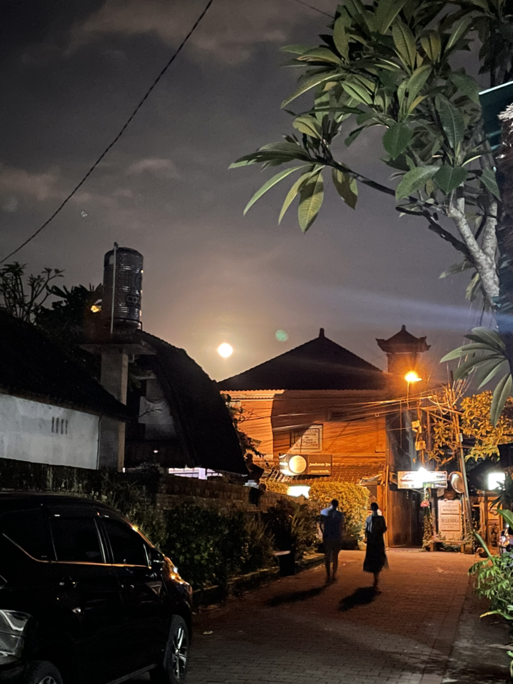 우붓 온 날, 한국은 백 년 만에 가장 큰 보름달이 뜨는 날이었다. 9월 10일 추석, 나의 생일이었다. 보름달을 발리에서라도 보고 싶었지만, 그날은 저녁 내내 비가 와 볼 수 없었다. 마음속으로 보름달을 볼 수 있으면 좋겠다고 생각했다. 다음 날 요가를 마치고 숙소로 돌아와 마사지를 받아볼까 하고 나선 길에 건물 틈 사이로 무엇인가를 보았다. 직감적으로 알 수 있었다. 보름달. 발리는 모두 높이가 비슷한 낮은 건물이고 달도 낮게 뜨기 때문에 건물에 가려 볼 수 없었다. 하지만 마사지 가게를 찾아가는 동안 보름달이 계속 함께했다. 그리고 마사지 가게 앞에 도착했을 때 보름달이 가게 위에서 또렷이 보였다. 원하는 대로 보름달을 보았다. 나는 가슴 벅참과 감사함을 느꼈다. 그리고 가장 완벽한 마사지를 받을 수 있었다.