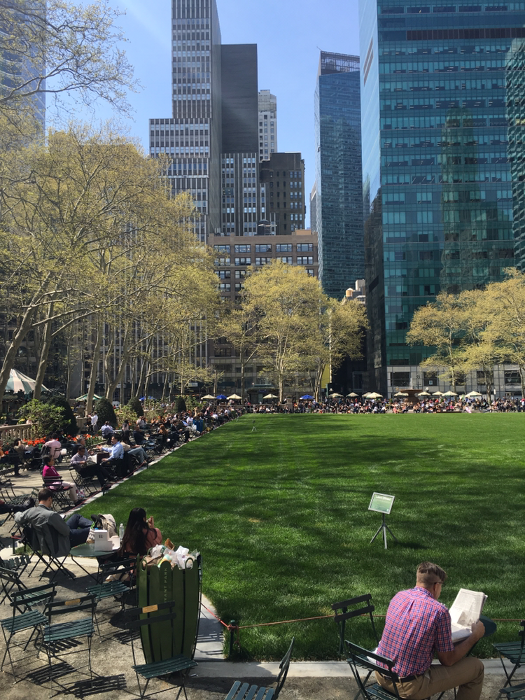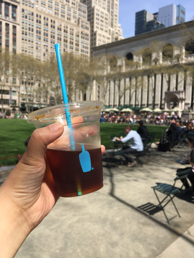 이젠 자전거를 타보자! 사실 이거 할때 사연이 좀 있는데.. 자전거를 제대로 안꽂았다간 평생 카드 요금이 지불 될 수 있으니 정말 조심해야한다.. 사용방법은 "뉴욕 시티 자전거" 블로그 검색하면 굉장히 자세히 잘 나옴 ㅎㅎ 각설하고 우여곡절 끝에 자전거를 빌려 타고 호기롭게 브라이언 파크로 향하였건만.. 가는 곳마다 공사판, 난장판, 차도 사람도 너무 많고, 봄바람 맞으며 살랑살랑 맨하튼을 누비는 영화같은 장면을 꿈꿨건만 그런건 멍멍이나 줘버려 ㅜㅜ 진짜 죽을 고비 몇번 넘기고 땀 범벅으로 도착한 브라이언 파크! 타겟은 물론 Blue Bottle Coffee이다.