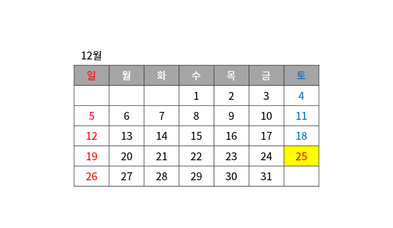 크리스마스는 여느 주말처럼 가족과 함께 보내는 건 어떠세요? 12월 달력을 보면 2022년 신정도 토요일이라는 걸 알 수 있네요.