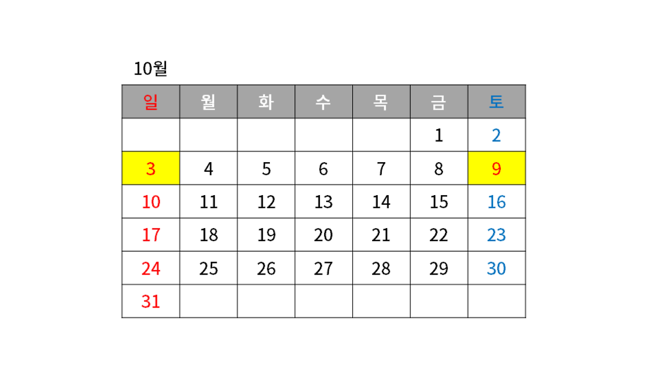 추석 때 푹 쉬셨죠? 개천절과 한글날이 각각 일요일, 토요일입니다.