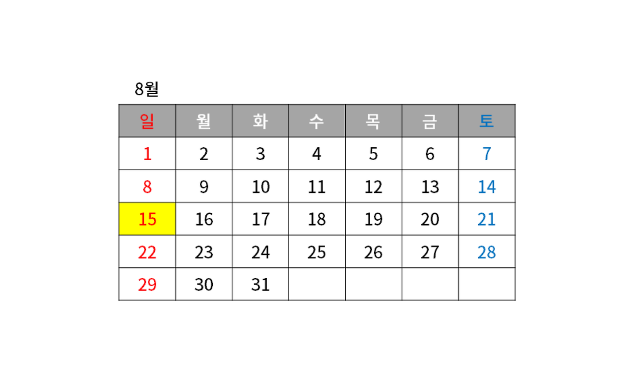 광복절도 일요일입니다. 6월과 7월에 이어 8월에도 공휴일이 하나도 없네요?