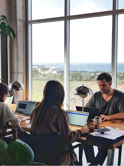 일단 자기 일에 진심이 분들이 많습니다. 회사에 속해 있던, 혼자 독립적으로 일을 하던 일을 할 때 그런 집중도가 느껴지는 분들이 많습니다. 왜 제주까지 오셨냐고 가끔 물어보면 딱히 이유가 있어서라기보다 일하는 배경을 바꾸고 좀 더 집중해서 일하고 싶어서(정말 일을 사랑하는 거죠) 왔다는 분들이 많았습니다. 그리고 일하는 시간이 끝나면 제주에 맛있는 것들을 먹을 수 있고 바닷가를 산책할 수 있는 것도 너무 좋은 일이라고 이야기하십니다.