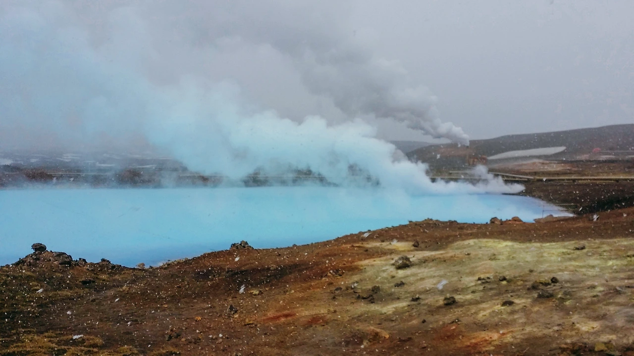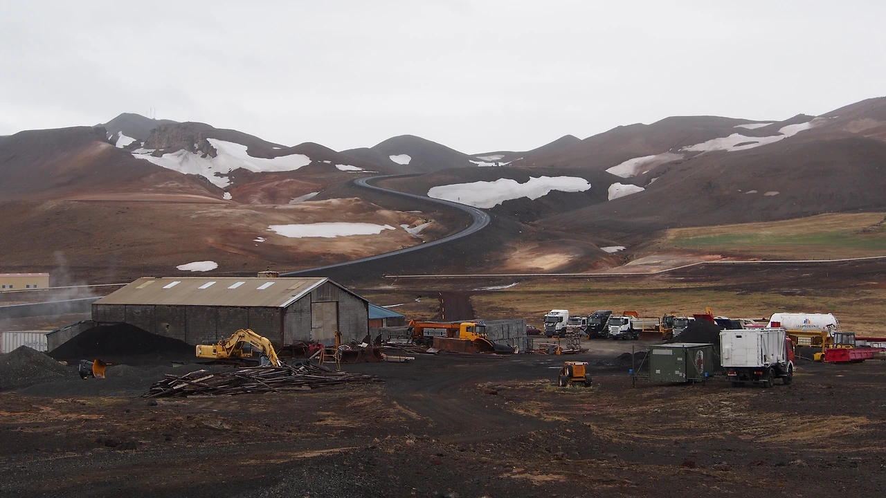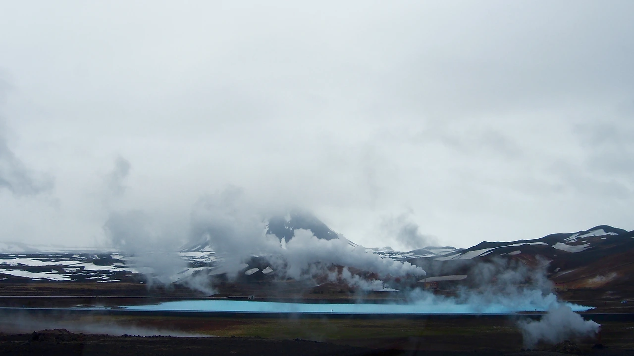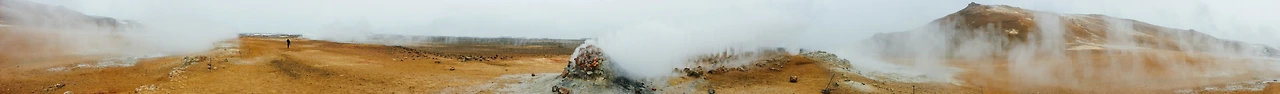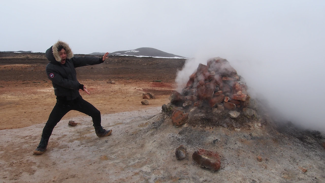 Hverir 주변은 활화산 지대입니다. 몇 키로 반경 내에 산 곳곳에서 커다란 증기를 뿜어내고, 지열발전소가 있으며, Iceland 제일의 담수온천이 있기도 합니다.