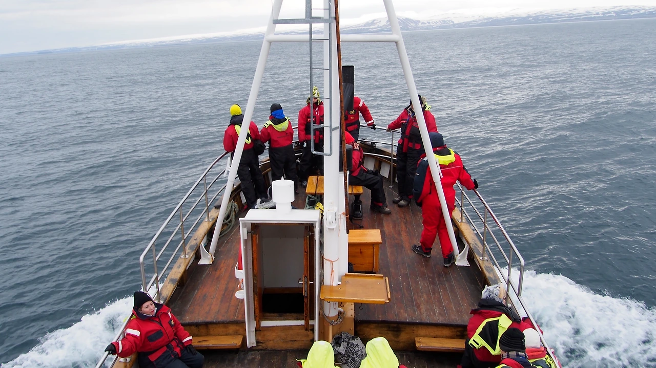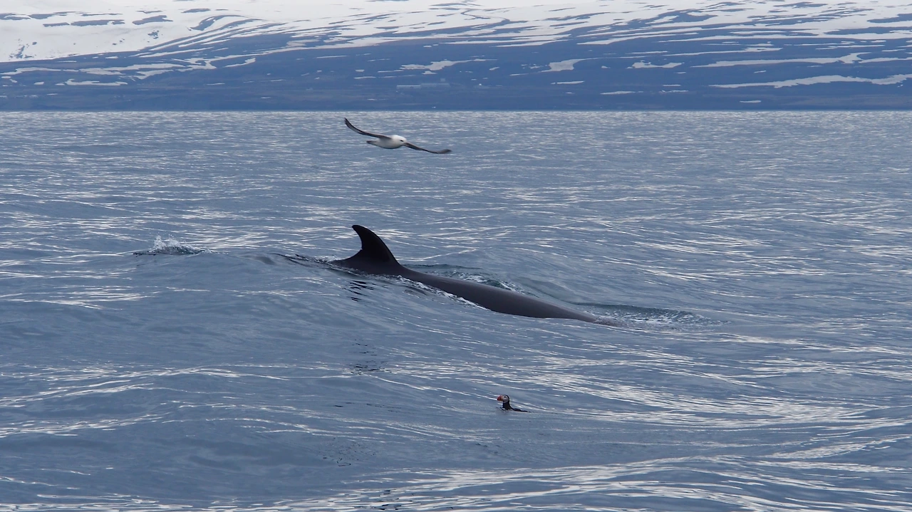 돌고래와는 다른 엄청난 몸집의 고래를 볼 수 있었습니다. 다만 아쉬운 건 고래들의 등지느러미 정도만 물밖으로 볼 수 있었습니다. 사진에서 보았던 멋진 점프라던지, 롤링이라던지, 꼬리지느러미 뽐내기 같은 모습은 아쉽게도 볼 수 없었습니다. 그럼에도, 북극해를 배를 타고 누비는 경험이나, 길들여지지 않은 북극해의 고래를 내 눈으로 직접 발견한다는 기쁨은 대단했습니다. 대략 열 마리 정도의 고래를 조우한 후 뭍으로 돌아옵니다.