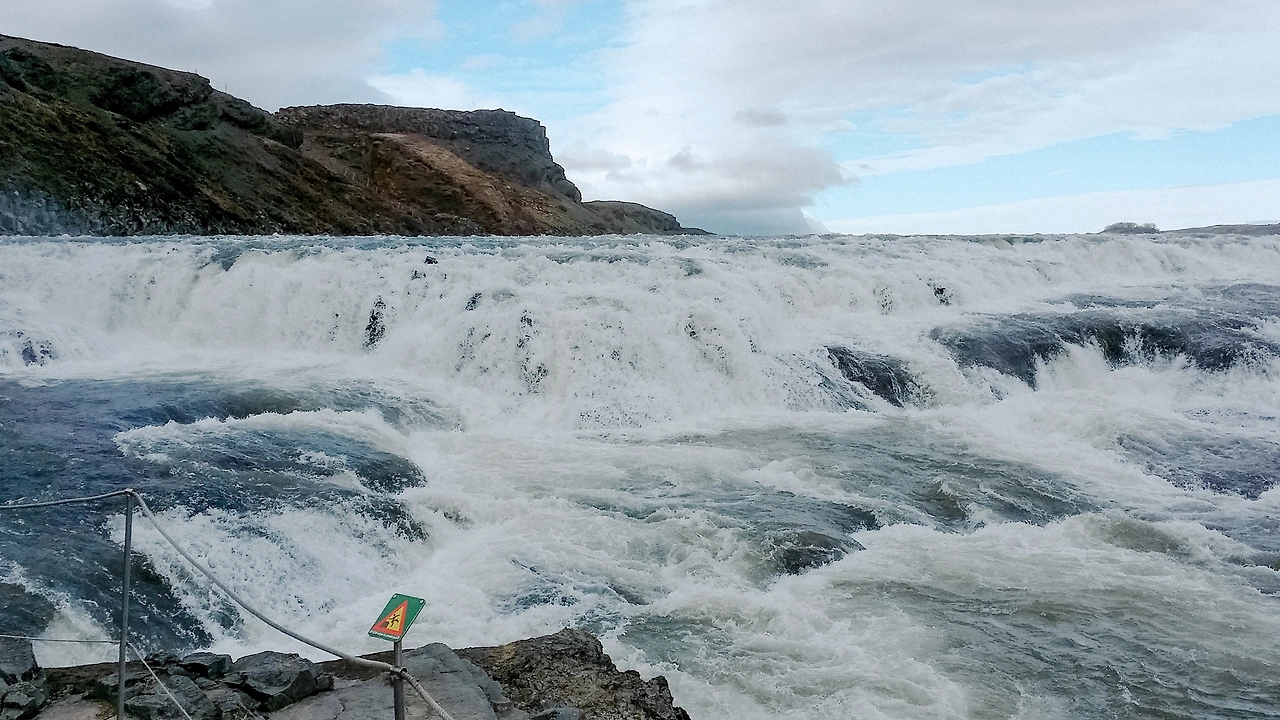 The Golden Triangle의 첫 번째 Gullfoss. Golden Waterfall이라고 합니다. 간소한 끈으로 막아 둔 가이드가 정감 있습니다. 물보라를 잔뜩 맞으며 엄청난 폭의 폭포의 위용일 실감합니다. 앞으로도 수많은 폭포를 보게 되지만, 모든 폭포마다 성격을 가지고 있어 교감하는 즐거움이 있습니다.