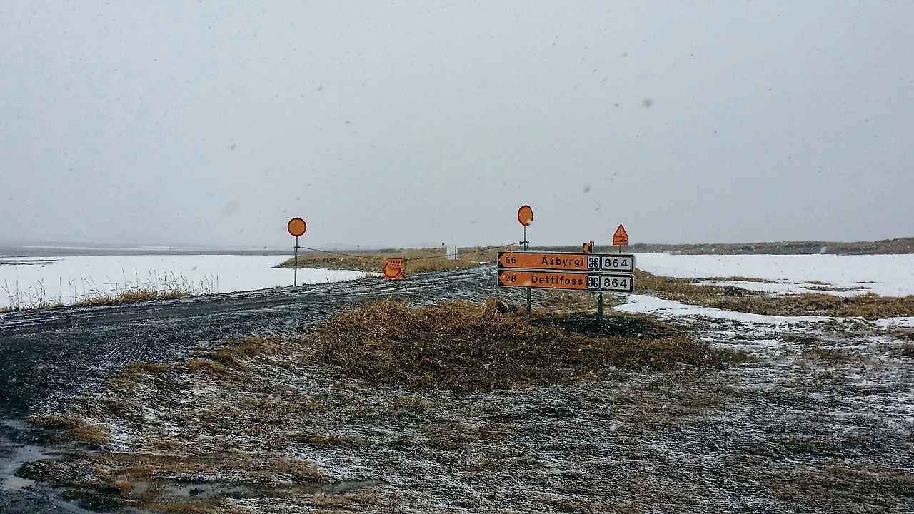 Dettifoss로 가는 길이 막혔습니다... 유럽 최대의 폭포라 엄청난 기대를 했는데 포기하려니 아쉬움에 발이 잘 떨어지지 않습니다. 한참을 멍 때리고 있는데, 또 다른 한 대의 차가 오더니 저희와 같은 상황에 멍 때리고 있더군요. 그러더니 곧 방향을 틉니다. 알고 보니 Dettifoss를 감상하는 사이트는 폭포의 왼쪽과 오른쪽 두 군데가 있고, 오른쪽 사이트로 가는 길이 막혀 있었습니다. 왼쪽 사이트로 가는 길은 열려있다는 소식을 듣고 서둘러 뒤따라 이동을 합니다.