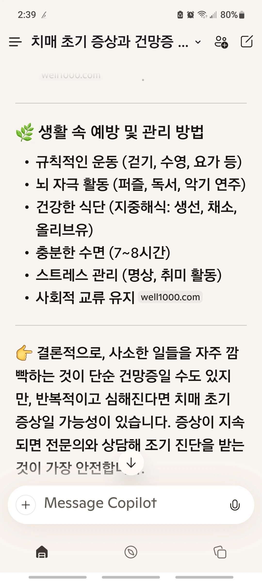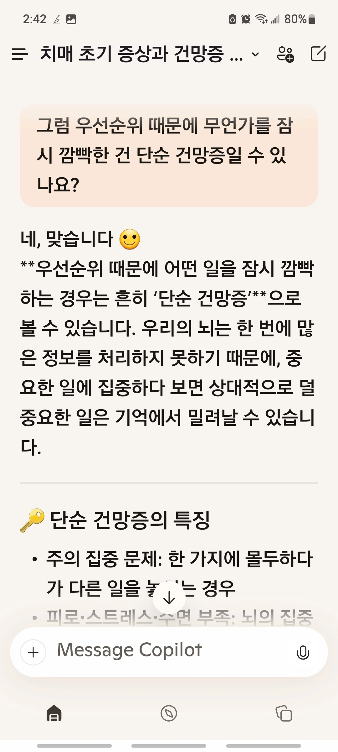 그러면서 순간 그리고 문득 겁이 났다. 가족력 때문이기도 해서 혹시 내가 치매 조기증상이 아닐까? 옛날에 티비 방송이나 신문에서 자가 진단 같은 걸 본 기억이 있었지만 명확한 정리가 당장 필요했다. 그래서 얼른 코파일럿을 열었다. 결론적으로 얻은 첫 번째 대답은 이거였다.