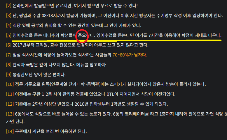 무엇보다도 나를 더 힘들게 했던 건 바로 위의 나무위키에도 기재되어 있는 '잉글리시 라운지'였다. 영어수업을 교양으로 듣던 전공으로 듣던 무조건 여기에서 한 학기당 몇 시간 이상을 반드시 보내야 하는데, 이곳에서는 무조건 영어만 써야 하고 한국어 쓰면 벌점을 받게 된다. 당시 정말 어떻게 시간을 때웠었는지 지금 생각해도 참 아찔(?)하다.