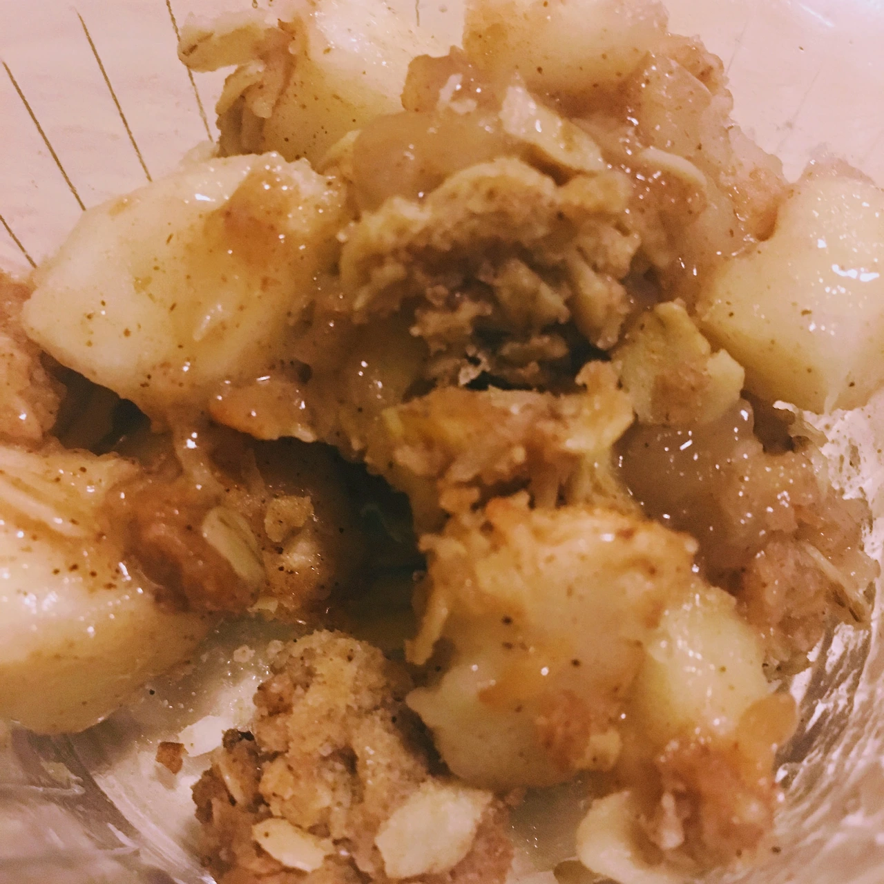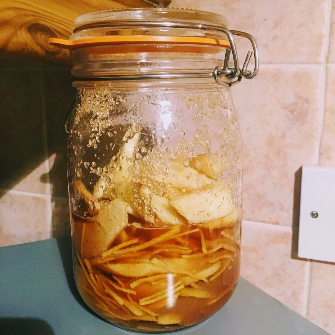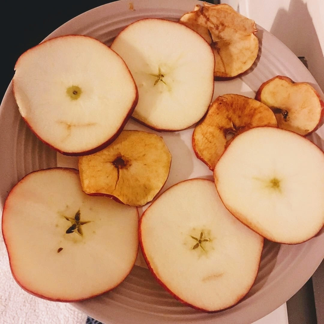 집에 와서 딱히 손이 잘 가지 않아 우선 며칠 쇼핑백을 부엌과 거실사이에 가만 놓아 두었다. 집안에 그득해진 사과 향에 이끌려 자꾸만 눈이 갔다. 이 많은 사과를 어찌 처리해야하나 하며 결국 한 달간 사과먹기 프로젝트를 시작했다. 사과생강청도 만들어 보고, 사과를 생강과 아예 통째로 넣어 사과생강차도 끓여봤다. 신맛이 울컥나기도 했고 사과가 다 부스러져 상한 것처럼 차에 둥둥 떠다녔다. 왜 배생강차가 나왔고 사과생강차는 안나오는지 알 것도 같았다. 당근 케일과 갈아도 먹어봤다. 사과를 큼직큼직 썰어 계피와 버무리고, 그 위에 오트, 설탕, 코코넛 오일을 뭉쳐 오븐에 구운, 겉은 바삭하고 안은 촉촉한 디저트인 애플 크럼블도 처음으로 만들어 봤다. 그리고 올리브가 아는 사람(사과나무 주인)의 팁을 전수 받아 사과를 얇게 저며 말려서 먹어도 봤다.