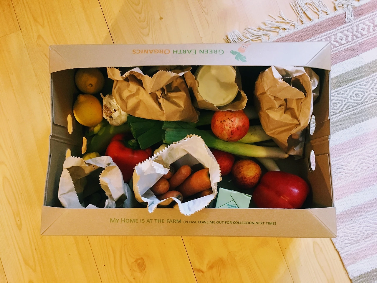 땅을 잘 알고 또 아끼는 사람들이 키운 작물을 포장지 없이 사는 방법은 아마도, 근처의 유기농 농장을 찾는 것일거다. 혹시나 해서 구글에서 Organic farm 을 검색하니 아니 왠걸, 내가 사는 지역 바로 인근에 정확히 내가 원하는 농장이 있다. 바로 코 앞에 있었는데 이걸 모르고 벌써 1년 반을 살았다니. 아예 이러한 옵션조차 상상하지 못했던 삶에서, 구글 서치 1회로 바로 내 코 앞에 있는 것을 이제서야 발견하는 삶으로 점프. 아니 뭐 이렇게 극단적으로 쉬운 것을 까맣게 생각 조차 못하고 살았을까, 바보 같기도 하고 뒷통수를 때려맞은 것 같았다. Plastic-free box 라 해서 플라스틱 포장은 아무 것도 없이 종이 박스에 유기농 농산물을 배송받을 수 있다. 주문하면 바로 배송되는 것은 아니고 로컬 딜리버리라 해서 지역마다 정해진 요일 별로 배송이 되고, 종이 박스는 접어서 다음 주문 때 반납한다. 박스 크기별로 야채, 과일, 혹은 야채+과일 패키지가 있었고 종류와 갯수가 조금씩 달랐다. 늘 주문한 농산물이 백프로 있는 것은 아니라, 없으면 내가 지정한 세 가지 대체 상품 중 랜덤 배송이 된다. 복불복으로 받아보는 재미가 왠지 쏠쏠했다. 버섯이나 당근은 비닐이 아닌 종이백에 담겨져 왔는데, 금방 상하곤 했던 마트표 비닐 포장 오가닉 제품들 보다 훨씬 오래 갔다.