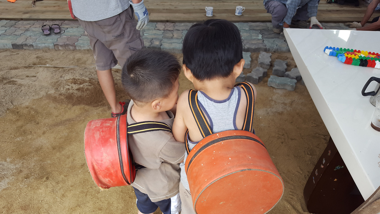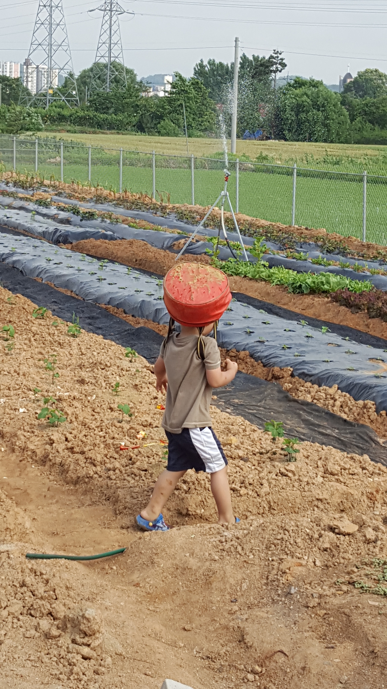 밭농사일 할 때 쪼그려 앉을 때 쓰는 엉덩이받침을 등뒤로 메고 닌자거북이라 하질 않나, 물에 맞을까 머리에 쓰질 않나 정말 창의적이다. 녀석들.