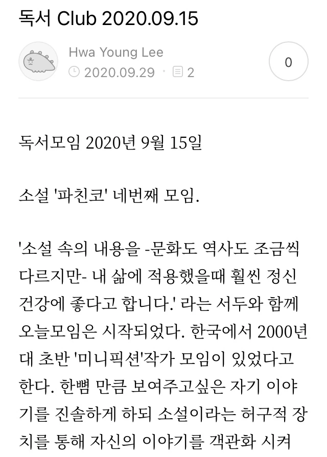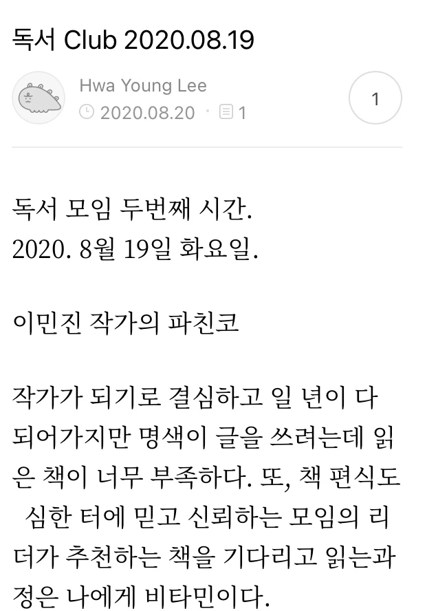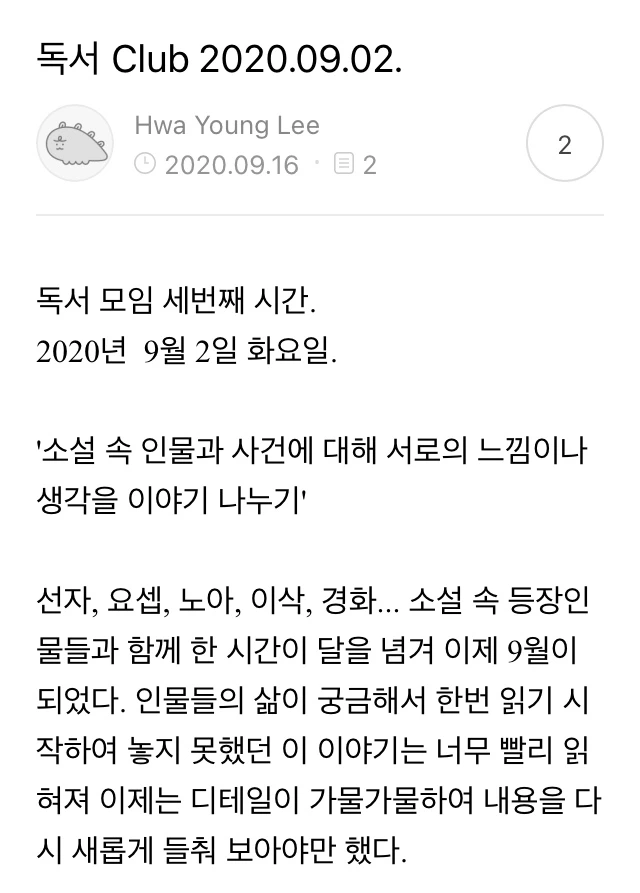 나는 이 모임의 Note를 남겨두면 좋을 것 같다고 생각이 들었고 그것을 내가 해 보자 생각했다. Target독자는 나와 리더 이숙 선생님 포함 총 네 명의 멤버로 정해 (몇 주 후 한 분이 더 늘어 이후부터는 다섯 명) 매번 우리의 모임을 글로 적어보기로 하였다. 내가 쓴 글을 email로 선생님께 보내면 선생님께서 읽어보시고 공지사항과 함께 다른 멤버에게 전달해 주시는 방식이었다. 처음에는 내가 이런 것을 써도 되나 싶었는데 어차피 내 독서와 작가 수업에 대한 기록이며 제한적이지만 선택된, 목적을 같이하는 분명한 독자가 확보된 글 쓰기였다. 누가 시킨 것도 아니었다. 스스로, 책과 관련한 경험을 옮겨본 글쓰기를 독자에게 전달하고 피드백을 받은 최초의 작품인 것이다. 메일은 희린이가 만들어 준 비공개 카페에도 정리해서 올려두고 네이버 블로그도 개설해서 글쓰기를 시작하며 독서 클럽에 대한 이야기를 쓰기 시작했다. 간단한 메모와 풀어서 쓰기, 그리고 경험한 이야기를 함께 나눌 수 있는 구체적 독자를 둔 글쓰기가 시작된 것이다.