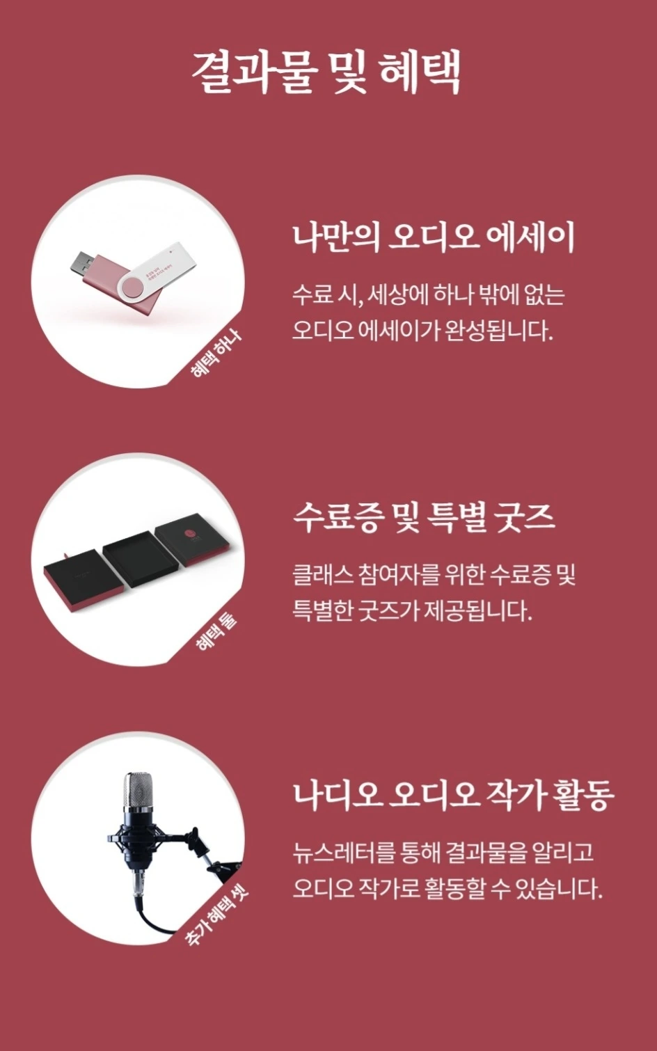이 수업은 글쓰기 수업과 보이스 트레이닝 수업, 실제 녹음실에서 녹음까지 해서 오디오 작가로 활동할 수 있는