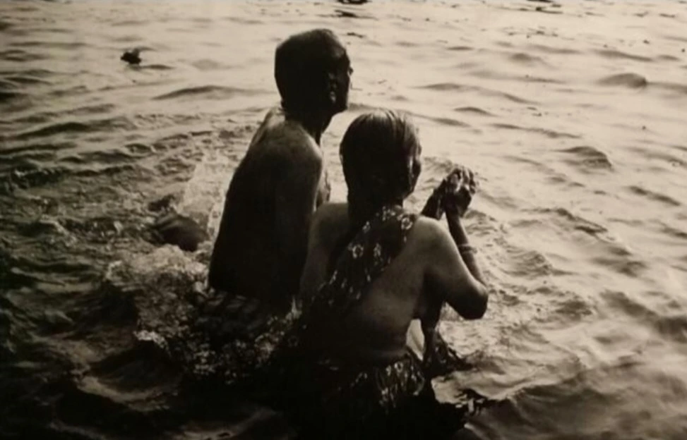 인도 갠지스 강에 노부부가 함께 물속으로 들어가는 뒷모습