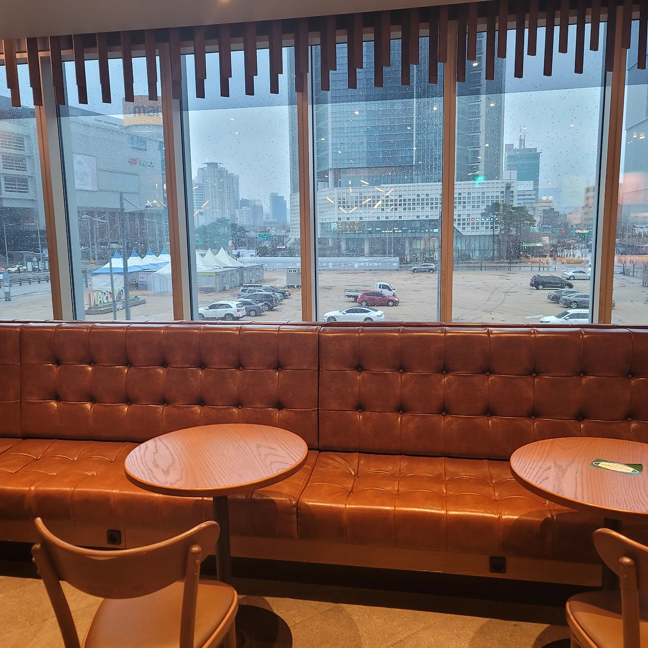 커다란 통창에 빗방울이 몽글몽글 맺혀있다.