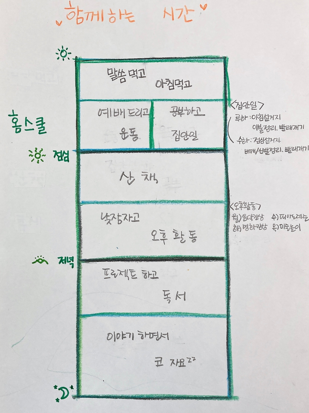시간표는 가정에서 일어나는 여러 변수에도 불구하고 홈스쿨링이 안정적으로 지속되게 하는 지지대가 되기 때문에 꼭 만들어보기를 권한다. 또한 아이들에게는 시간표대로 하루를 살아내는 연습이 게으름에 대한 훈련이 되기 때문에 유익하다.