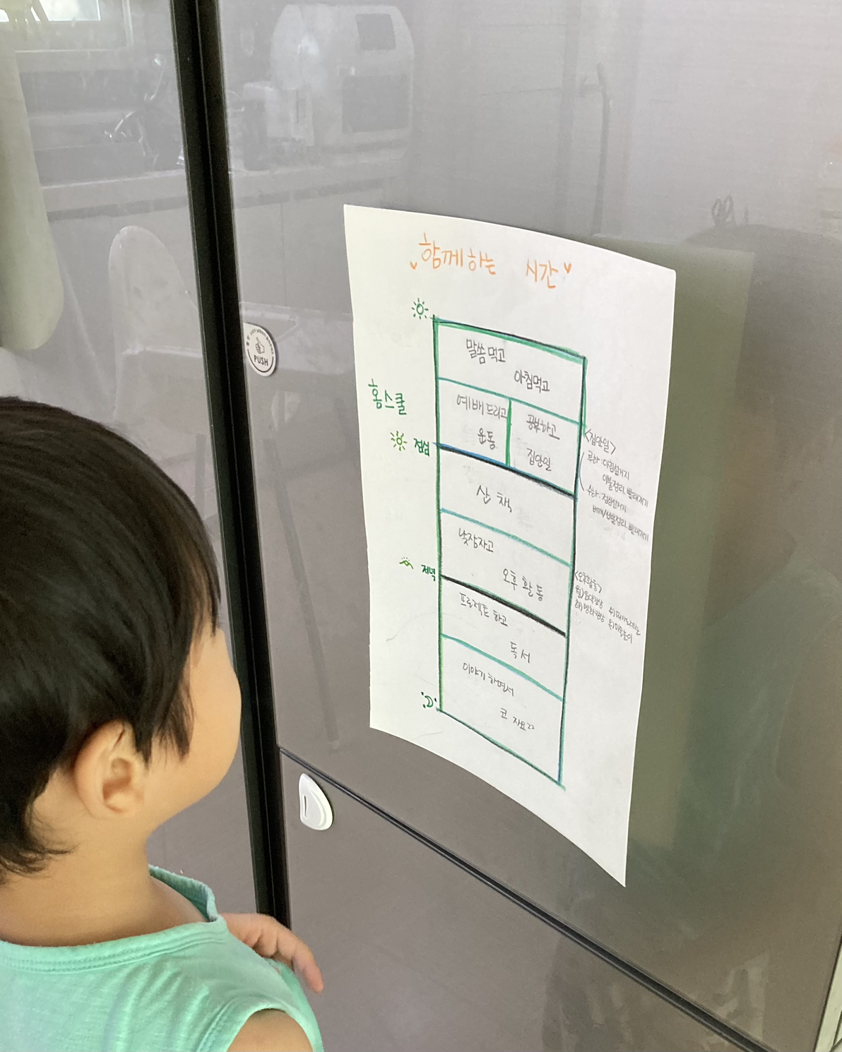 시간표가 최종적으로 완성되었다면 눈에 잘 들어오는 곳(반드시 엄마의 눈높이가 아니라 아이들의 눈높이여야 한다.)에 위치시킨다. 이상적으로 만들었다고 생각되는 시간표라 할지라도 시간표대로 홈스쿨링을 며칠 운영하다 보면 현실적으로 맞지 않는 부분, 이렇게 조정하면 더 좋을 것 같은 부분들이 눈에 들어올 것이다. 바로 떼어내어서 다시 만들고 싶은 욕구가 치솟더라도 조금 기다리자. 적어도 한 달간은 고정적으로 운영을 하다 보면 좀 더 장기적인 관점에서 고쳐야 할 부분들이 추려지고 정리된다. 그런 식으로 한 달간 운영 후에 조금씩 수정을 거듭하다 보면 우리 가정에 가장 잘 맞는 시간표와 그에 따른 루틴이 형성될 것이다. 천천히 찾아가면 된다.