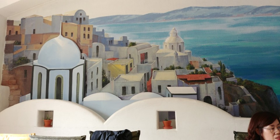 그리스의 유명한 섬 산토리니를 모방해 만든 카페에서 커피를 마셨다. 브런치 글, 책을 읽다( 그리스인 조르바) 배경으로 선택한 그림이 이곳에도 걸려있었다. 너무 유명한 그림이기 때문에 낯설지 않았지만, 그리스를 모방한 구조물들은 좀 작위적이어서 분위기가 어색했다. 그리고 사람은 얼마나 많은지 차를 마시기 위해 끝도 없는 줄을 서야했다. 어렵게 마련한 테이블에서 담소를 나누며 커피를 마셨는데, 그 향과 맛이 좋아 그나마 기다린 보람이 있었다.
