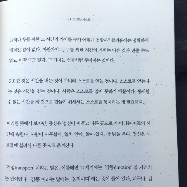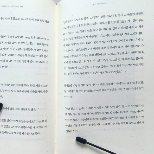 사색을 즐기는 사람이지만 한동안 이런 책을 읽을 수도 공감할 수도 없었다. 그런 여유 부림은 지금처럼 먹고살기 노력해야 하는 시기에는 절대 해서는 안 될 일로 스스로를 억제하곤 했다. 하지만 생긴 대로 사는 게 인간이니까, 이 책 곳곳에 나온 구절들은 내 머릿속을 헤집어 놓은 것 마냥 ‘나’ 그 자체였다.