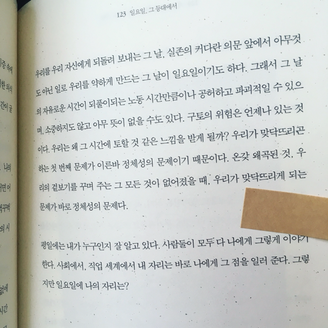 그리하여 일요일은, 휴식의 시간인 일요일은, 사람과 사람이 새롭게 맺어지는, 관계가 다시 창조되는 시간인 것이다. (123-129)