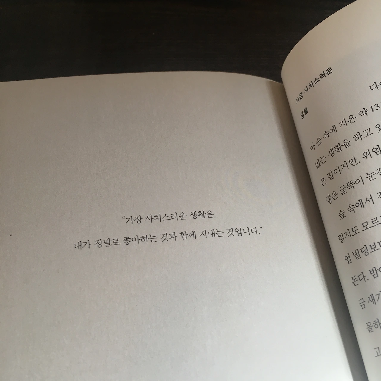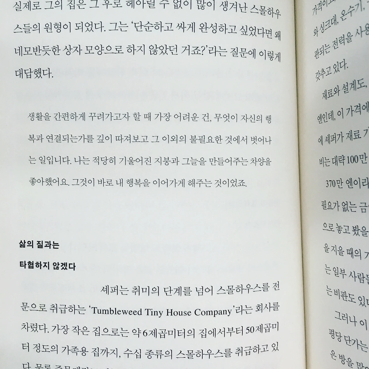 생활을 간편하게 꾸려가고자 할 때 가장 어려운 건, 무엇이 자신의 행복과 연결되는가를 깊이 따져보고 그 이외의 불필요한 것에서 벗어나는 일입니다. 나는 적당히 기울어진 지붕과 그늘을 만들어주는 차양을 좋아했어요. 그것이 바로 내 행복을 이어가게 해주는 것이었죠. (44)