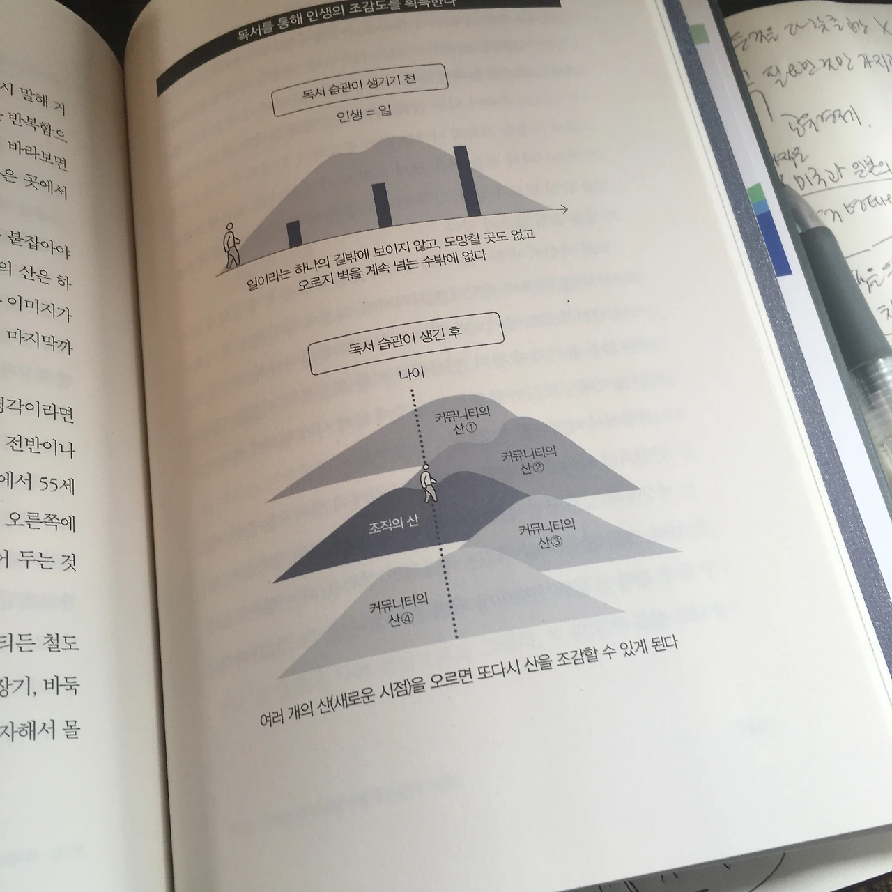 인생 후반에 여러 개의 산을 오르락내리락할 생각이라면 일을 통해 오른 가장 중점이 되는 산과는 다른 산을 인생의 전반이나 중반부터 만들어 둬야 한다. 그 산을 구축하기 위해 25세에서 55세까지의 30년간 조직에서 일하는 주축과 달리 왼쪽에 두 개, 오른쪽에 두 개 정도 각기 다른 커뮤니티에 자신이 설 자리를 만들어 두는 것이 필요하다. (116)