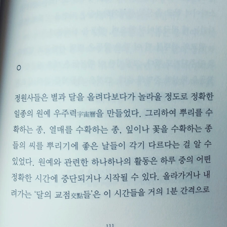 정원사들은 별과 달을 올려다보다가 놀라울 정도로 정확한 일종의 원예 우주력을 만들었다. 그리하여 뿌리를 수확하는 종, 열매를 수확하는 종, 잎이나 꽃을 수확하는 종들의 씨를 뿌리기에 좋은 날들이 각기 다르다는 걸 알 수 있었다. 원예와 관련한 하나하나의 활동은 하루 중의 어떤 정확한 시간에 중단되거나 시작될 수 있다. (111)