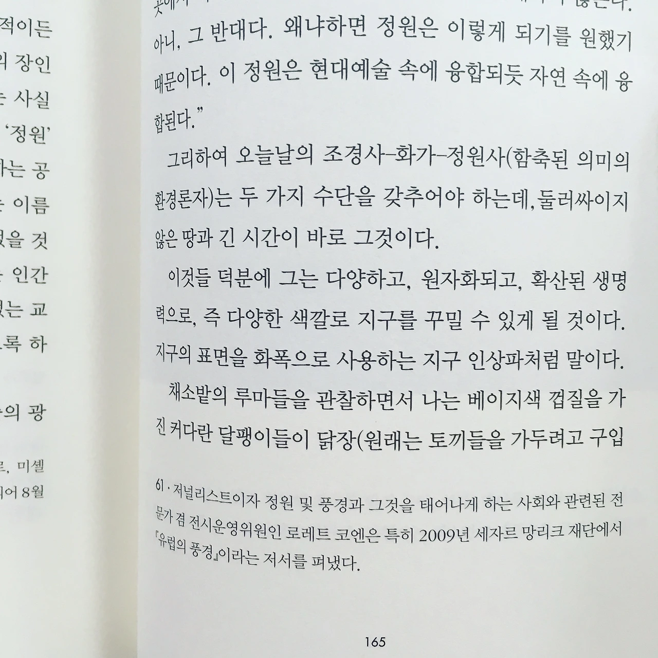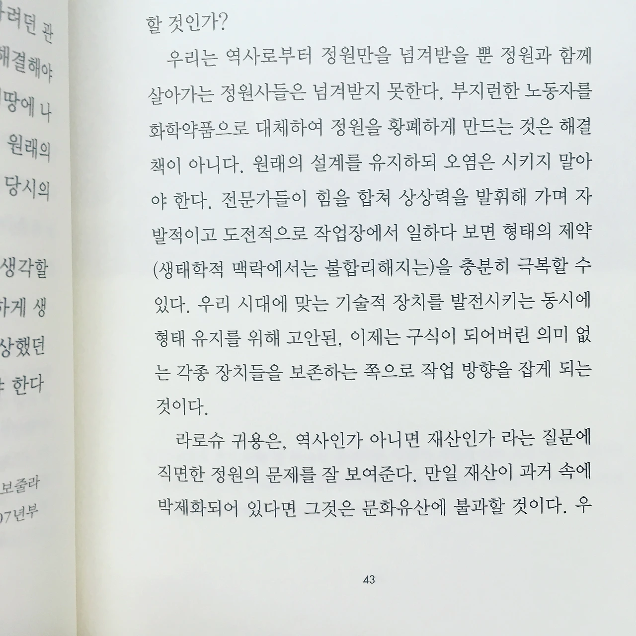 우리는 역사로부터 정원만을 넘겨받을 뿐 정원과 함께 살아가는 정원사들은 넘겨받지 못한다. 부지런한 노동자를 화학약품으로 대체하여 정원을 황폐하게 만드는 것은 해결책이 아니다. 원래의 설계를 유지하되 오염은 시키지 말아야 한다. (43)