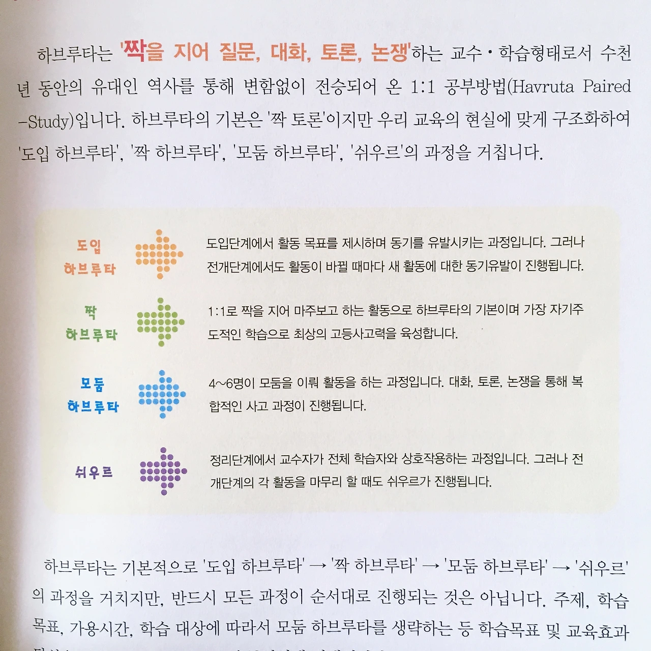 하브루타(havruta)는 ‘짝을 지어 질문, 대화, 토론, 논쟁’하는 학습법으로 유대인 성공 신화의 가장 큰 원동력인 1:1 공부방법이다. (12)
