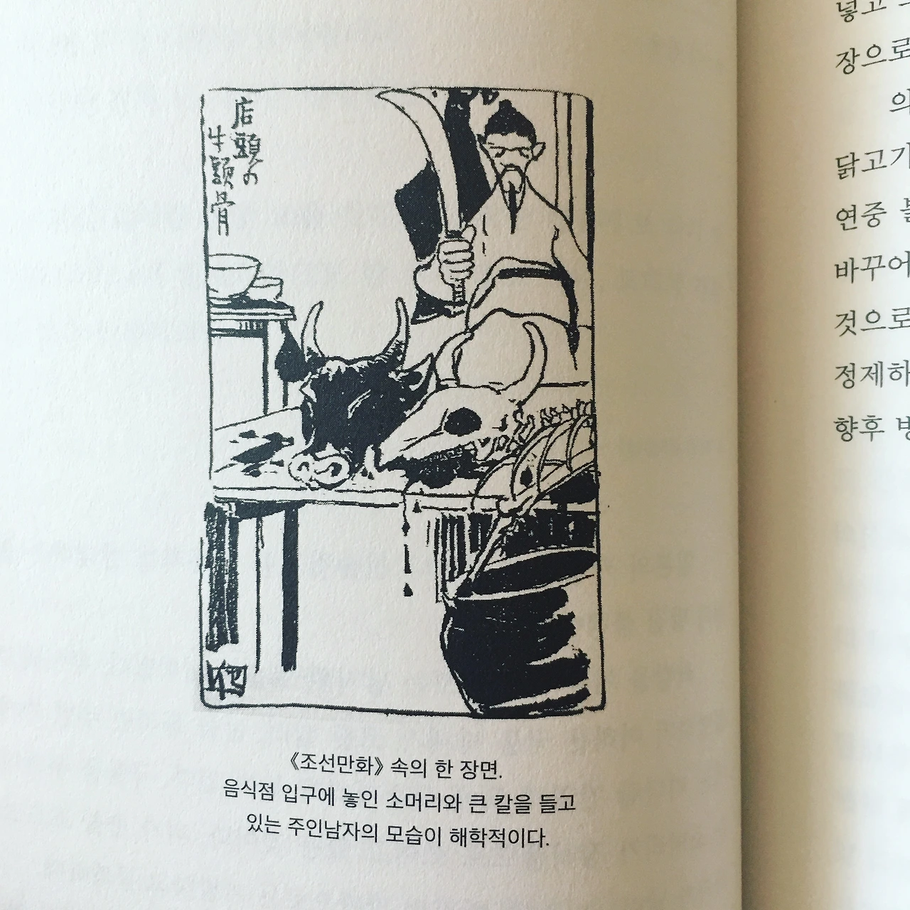 의사들의 말에 따르면 이 소머리 국물은 정말 좋은 것으로, 닭고기 국물이나 우유에 비할 바가 아니라고 한다. 커다란 솥을 연중 불 위에 걸어놓고 바닥을 비워 씻는 일 없이 매일 새 뼈로 바꾸어가며 물을 부어 끓여낸다. 이 국물, 즉 스프는 아주 푹 끓인 것으로, 매일 끓이기 때문에 여름에도 부패하지 않는다. 이것을 정제하면 아마 세계 어느 것과도 비교할 수 없는 자양제가 되고, 향후 병에 담아 한국 특유의 수출품으로 상용할 수 있을 것이다. -조선만화, 1909, 우스다 잔운. (61)
