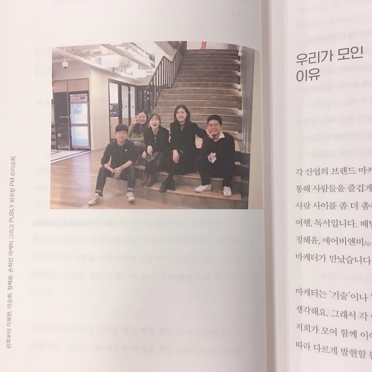두 책을 비슷한 시기에 읽고 함께 글을 쓰는 이유는 공통점이 느껴졌기 때문이다. ‘경제경영서’라는 공통점 외에도 몇 가지가 더 있었다. 첫째, 저자의 나이가 30대 초반으로 비교적 어리다는 것. 20대 후반~30대 후반일지도 모르지만 노련한 사회경험자의 글이라기보다는 현재진행형인 젊은 열기와 에너지를 느낄 수 있었다. 두 번째는 저자 5명 모두 읽고 쓰기를 잘한다는 것이다. 조현우는 이미 2권의 책을 출판한 경험이 있고, 이승희는 블로그와 브런치에서 활동 중이며 다른 저자들의 글도 매끄럽게 읽을 수 있었다.